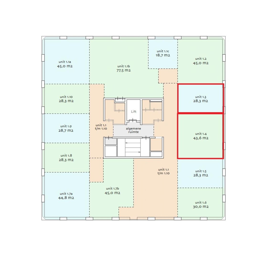 *het metrage is inclusief toebedeling van de algemene ruimten zoals onder andere de entree, toiletgroepen, gangen en de gemeenschappelijke pantry/ vergader-/ wachtruimten. De oppervlakte is gemeten volgens NEN 2580.