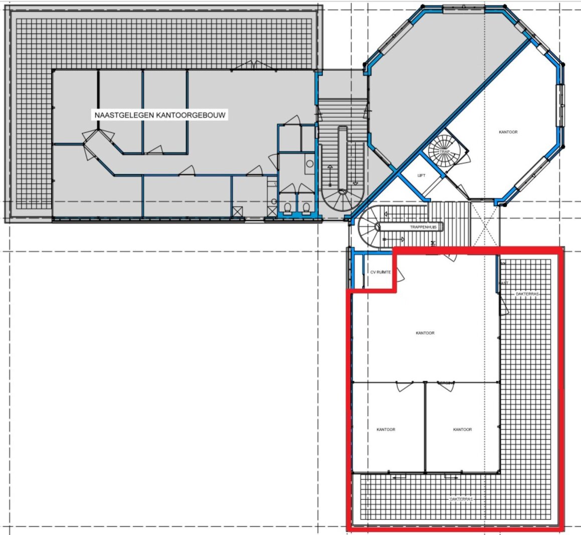 Circa 110 m² v.v.o. kantoorruimte (80 m² dakterras) + 2 p.p. op de tweede verdieping.